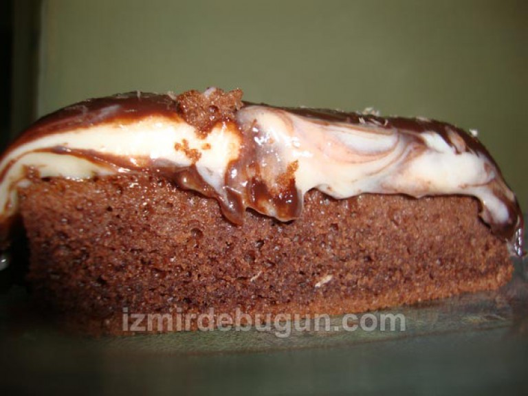 - Bir paket krem şanti, 1 su bardağından 2 parmak noksan sütle çırpılır. Sonra soğumaya bıraktığımız muhallebiye eklenir. Birbirine iyice karıştırıldıktan sonra kekin üzerine dökülür ve iyice yayılması sağlanır.