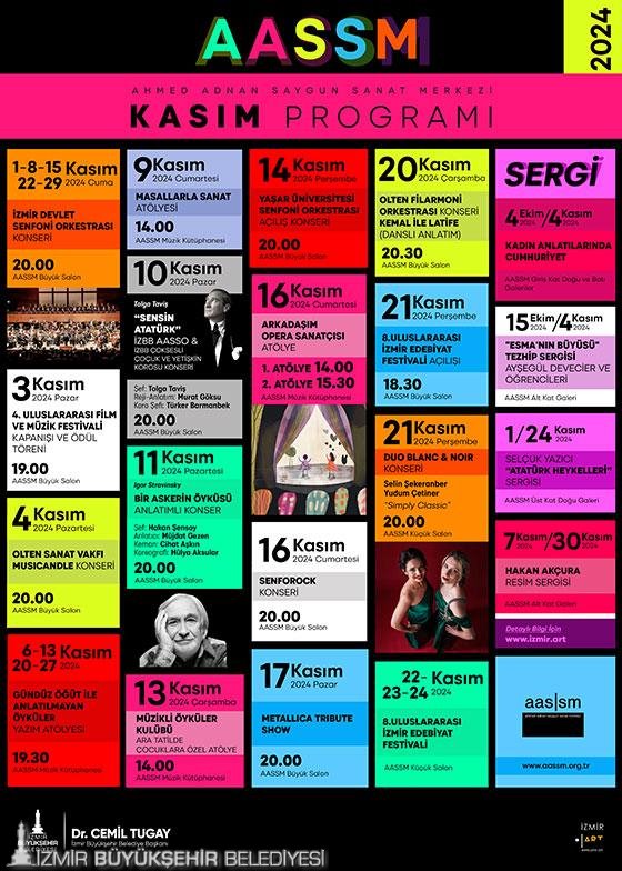İzmir Büyükşehir Belediyesi Ahmed Adnan Saygun Sanat Merkezi’nin (AASSM) kasım ayı etkinlikleri, 1 Kasım’da saat 20.00’de İzmir Devlet Senfoni Orkestrası’nın konseri ile başlıyor. Konser, 8-15-22-29 Kasım tarihlerinde de gerçekleştirilecek.