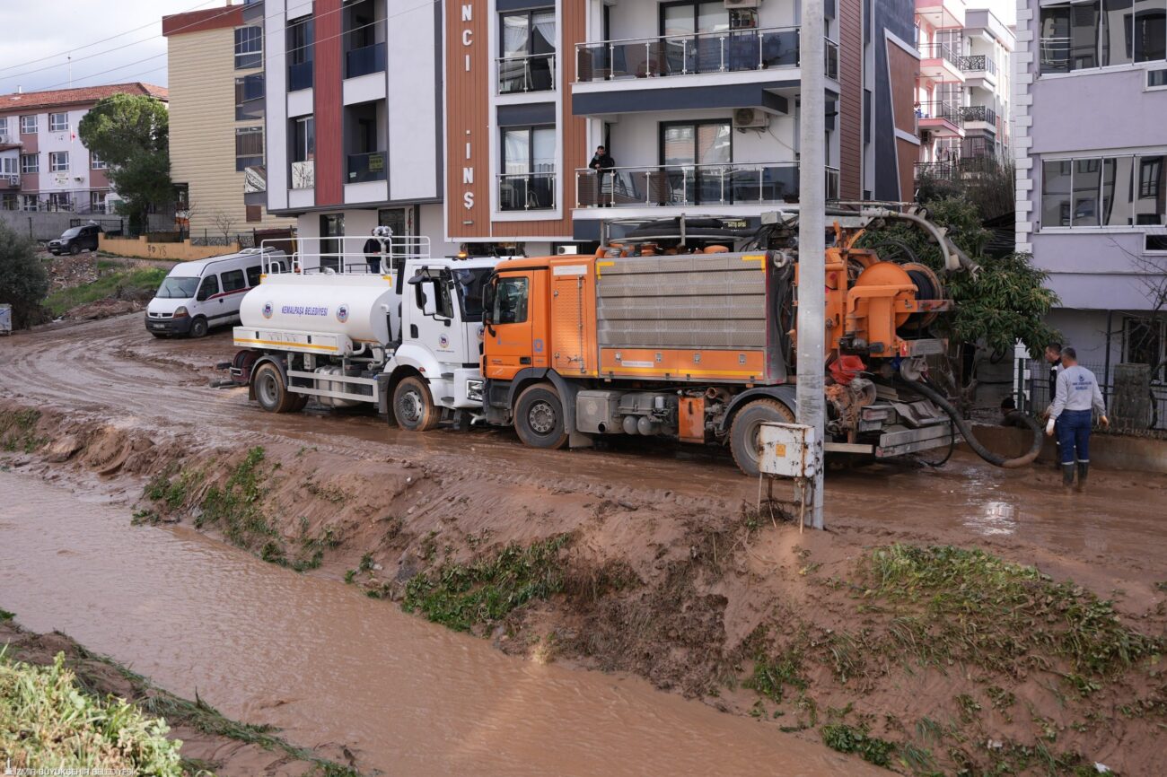 İzmir’de dün gece şiddetini artıran ve kısa sürede etkili olan yağışlar hayatı olumsuz etkiledi. En yoğun yağış Buca’da görülürken, Konak, Bornova ve Kemalpaşa’da da sağanak etkili oldu. Yaklaşık 1,5 saat içerisinde bazı bölgelerde metrekareye 80 kilogram, İzmir genelinde ise ortalama 45 kilogram yağış düştü. Kemalpaşa Ulucak’ta taşkın sırasında İncepınar Deresi’ne sürüklenen dört araçtan üçü menfezin diğer ucundan çıkmayı başarırken, bir araç menfez içerisinde sıkışarak kaldı. Geceden sabaha kadar süren çalışmalarda İzmir Büyükşehir Belediyesi Kanalizasyon Dairesi Başkanlığı ile Kemalpaşa Belediyesi ekipleri koordineli şekilde görev yaptı. Sıkışan aracı çıkarmak için ilk etapta halatla çekme yöntemi denendi ancak yoğun sıkışma nedeniyle halatların koptuğu öğrenildi. Bunun üzerine vinç çağrıldı. Yağmur beklentisinin devam etmesi ve pazar günü için yoğun yağış uyarısı yapılması nedeniyle ekipler, menfezde sıkışan aracı parçalarını sökerek çıkarmaya çalışıyor.
