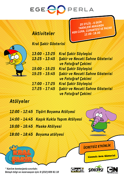 Ege Perla’ya gelen 3 yaş ve üzeri tüm çocukların ücretsiz katılabileceği Kral Şakir gösterileri ve 5-10 yaş arası çocukların katılabileceği atölye çalışmaları için önceden rezervasyon yaparak çocukların eğlenceli ve güzel vakit geçirmesini sağlayabilirsiniz.