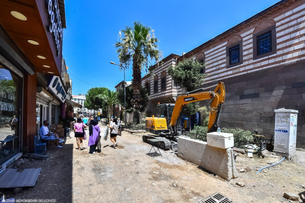 İzmir Büyükşehir Belediyesi iştiraki İZBETON A.Ş’nin tarihi çarşıda yürüttüğü çalışmalar tüm hızıyla devam ediyor. Projenin birinci etabı kapsamında birçok sokakta yapılan altyapı ve üstyapı çalışmaları teker teker tamamlanıyor.