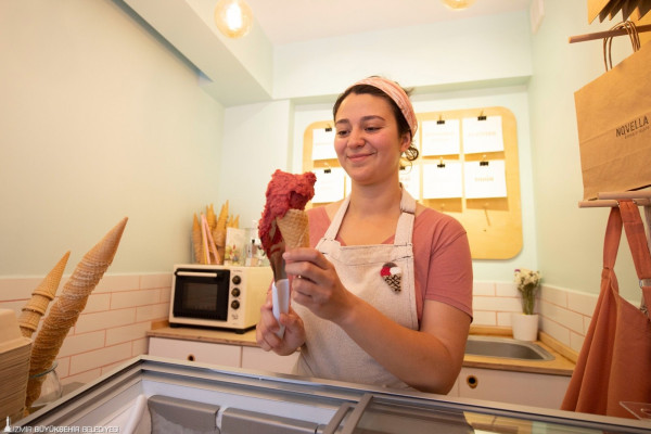 İzmir’de girişimcilik ve inovasyon kapasitesini geliştirmek için İzmir Büyükşehir Belediye Başkanı Tunç Soyer’in vizyonuyla kurulan FikrimİZ’de “Gıda Girişimciliği“ programında birincilik ödülünü alan Aslı Kaya, hayallerine kavuşarak Bostanlı’da kendi işyerini açtı. 29 yaşındaki Aslı Kaya, İtalya’da mimarlık eğitimi alırken karar verdiği projesinin adını da İtalyanca hikaye anlamına gelen “Novella” koydu. Kaya, “İzmir Büyükşehir Belediyesi’nin Gıda Girişimciliği ve Sosyal Girişimcilik programında aklımda olan bu işi bir plana döktük ve ayakları yere basan hale getirdik. Bu program dükkan açma ve dondurmamı markalaştırma konusunda beni hızlandırdı. Tedarikçilerimle yolum da İzmir Büyükşehir Belediyesi sayesinde kesişti. Örneğin benimle birlikte Gıda Girişimciliği ve Sosyal Girişimcilik programına katılan Şerife Hanım’dan Menemen Emiralem’de ürettiği çilekleri alıyorum. Bütün malzemelerimi üreticilerden almaya gayret gösteriyorum” dedi.