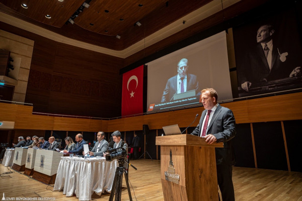 İzmir Büyükşehir Belediyesi’nin Aralık ayı olağan meclis toplantısının birinci oturumu Ahmed Adnan Saygun Sanat Merkezi’nde (AASSM), İzmir Büyükşehir Belediye Başkanı Tunç Soyer’in yönetiminde yapıldı. Meclis oturumunda İzmir Büyükşehir Belediyesi Raylı Sistem Dairesi Başkanı Mehmet Ergenekon Buca-Üçyol Metrosu’nun ihale ve değerlendirme sürecine ilişkin bir sunum yaptı. İzmir Büyükşehir Belediyesi Genel Sekreter Yardımcısı Ertuğrul Tugay da Başkan Tunç Soyer’in “Başka Bir Tarım Mümkün” vizyonu doğrultusunda yürütülen çalışmalar hakkında meclis üyelerine bilgi verdi.