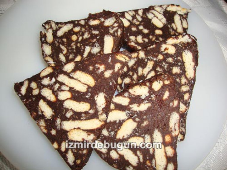 - Hazırlanan karışım daha sonra bir poşetin üzerine dökülüp uzun bir kalıba yerleştirilerek buzdolabında en az iki saat bekletilir.