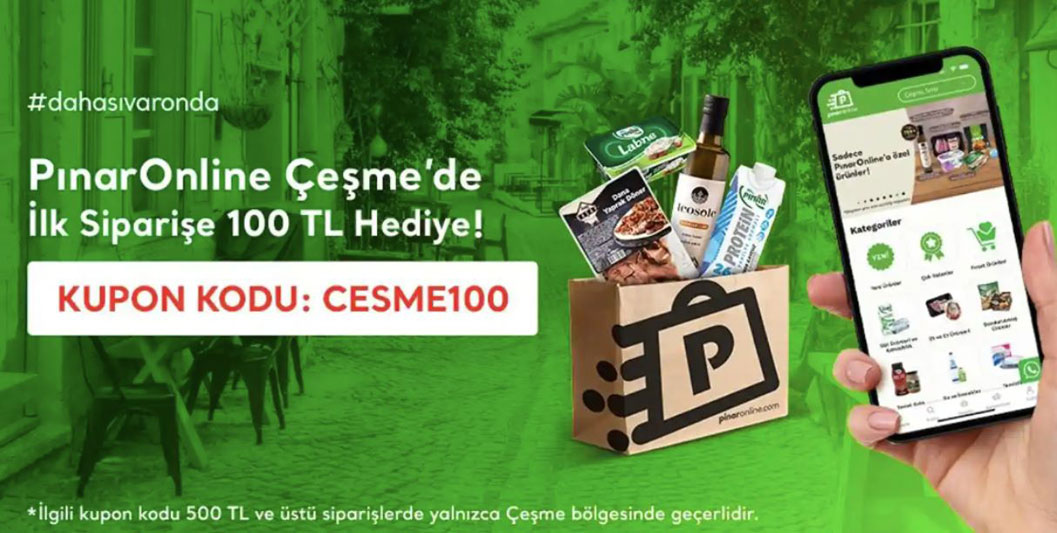 PınarOnline’dan alışveriş yapmak isteyen kullanıcılar için de indirim kuponu bulunuyor. Çeşme’den ilk kez sipariş verecek kullanıcılar CESME100 kupon kodu ile 100 TL indirimli alışverişin keyfini çıkarıyor. Çeşme’de adrese teslimat seçeneğini tercih eden kullanıcıların teslimatları aynı gün gerçekleştiriliyor.