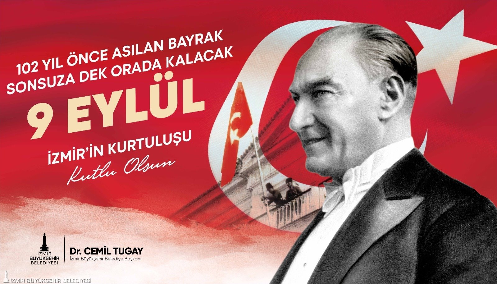 İzmir Büyükşehir Belediye Başkanı Dr. Cemil Tugay, “İzmir’in kurtuluş günü 9 Eylül 1922, Türkiye’nin talihinin döndüğü tarihtir. 102. yılında İzmir’in kurtuluş, cumhuriyetin kuruluş bayramı 9 Eylül kutlu olsun! Zafer Yürüyüşü ile başlayacak 9 Eylül kutlamaları gün boyu devam edecek. Tüm İzmirlileri bayraklarıyla bu coşkuyu birlikte yaşamaya davet ediyoruz. Gelin, 9 Eylül’ü İzmir’e yakışan bir görkemle kutlayalım” dedi.