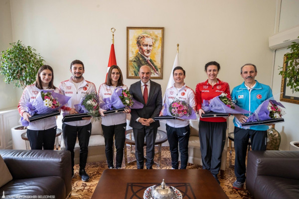 Bakü’de düzenlenen Trampolin Cimnastik Dünya Kupası’nda Türkiye adına ilk kez Dünya şampiyonluğu elden eden Sena Elçin Karakaş ve Sıla Karakuş ile yarışmada derece elde eden Hüseyin Engin Yontucu ve Gürkan Mutlu, İzmir Büyükşehir Belediye Başkanı Tunç Soyer’i makamında ziyaret etti. Ziyarette İzmir Büyükşehir Belediyesi Gençlik ve Spor Hizmetleri Dairesi Başkanı Hakan Orhunbilge ve sporcuların antrenörleri de yer aldı.