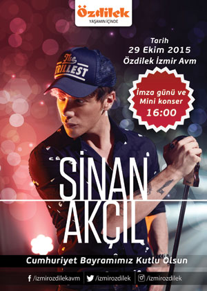 Özdilek Alışveriş Merkezi’nde Sinan Akçıl İmza günü ve mini konserin yanısıra Avm’ye gelen her ziyaretçiyi Türk Bayrağı hediye edilecek. Cumhuriyet Bayramı’nda Sinan Akçıl mini konseri ve İmza gününe tüm izmirliler davetli.