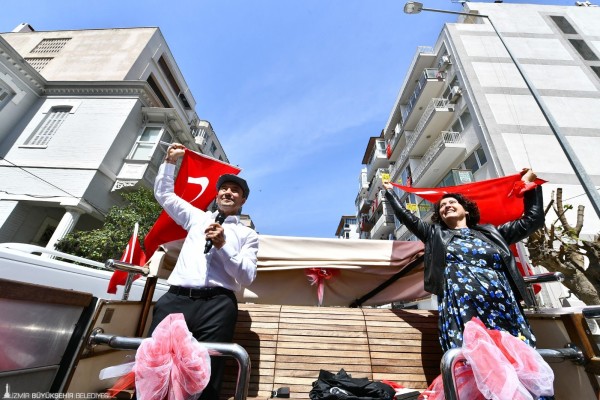 İzmir Büyükşehir Belediye Başkanı Tunç Soyer ve eşi Neptün Soyer 23 Nisan Ulusal Egemenlik ve Çocuk Bayramı’nda otobüsle şehrin sokaklarını dolaştı. Parklarda oynayan çocuklar, alışveriş yapmak için çıkan yurttaşlar ve balkonlarından kendilerini, Türk bayraklarının yanı sıra alkışlar eşliğinde coşkuyla karşılayan İzmirlilerin bayramını kutlayan Başkan Tunç Soyer, geçtiği güzergahta çalışanlara ve esnafa da seslenerek hayırlı işler diledi.
