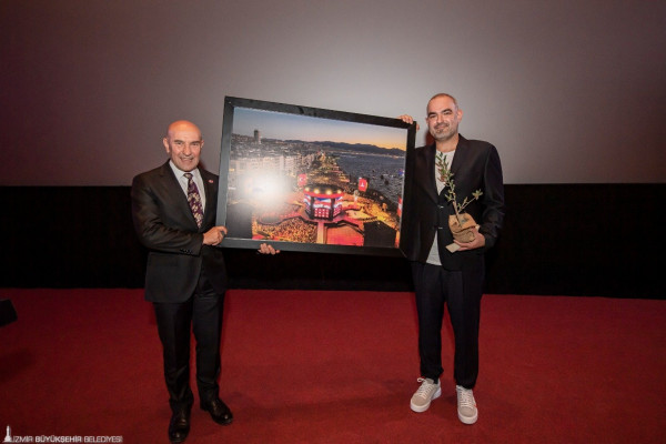 Soyer konuşmasının ardından filmin yapımcısı Murat Can Terzi’ye barışın simgesi zeytin fidesi takdim etti. Terzi de Başkan Soyer’e 9 Eylül akşamının havadan çekilmiş fotoğrafını hediye etti.