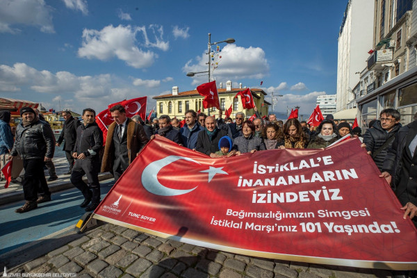 İzmir Büyükşehir Belediyesi bağımsızlık mücadelesinin simgesi İstiklal Marşı’nın kabulünün 101. yılını Konak Atatürk Meydanı’nda düzenlediği törenle kutladı. Tören öncesinde İzmirliler, İzmir Büyükşehir Belediyesi Bandosu eşliğinde Cumhuriyet Meydanı’ndan Konak Atatürk Meydanı’na yürüdü. Korteje İzmir Büyükşehir Belediye Başkanı Tunç Soyer, CHP İzmir İl Başkanı Deniz Yücel, Konak Belediye Başkanı Abdül Batur, Foça Belediye Başkanı Fatih Gürbüz, Güzelbahçe Belediye Başkanı Mustafa İnce, Balçova Belediye Başkanı Fatma Çalkaya, Karaburun Belediye Başkanı İlkay Girgin Erdoğan, İzmir Kent Konseyi Başkanı Prof. Dr. Adnan Oğuz Akyarlı, siyasi partilerin temsilcileri, İzmir Büyükşehir Belediyesi’nin bürokratları, meclis üyeleri, sivil toplum kuruluşlarının, odaların ve derneklerin temsilcileri, muhtarlar ve yurttaşlar katıldı.