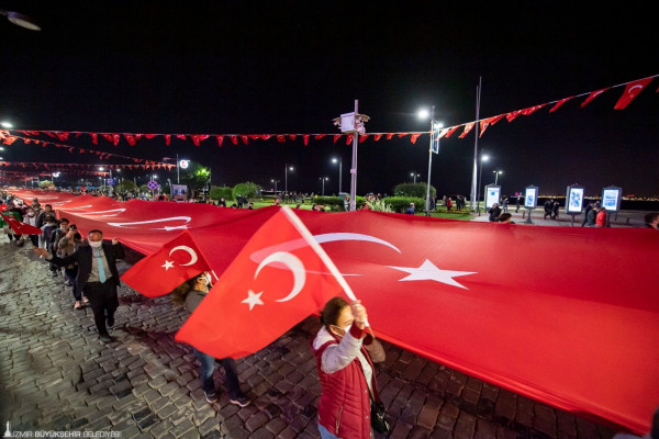 Cumhuriyet’in kenti İzmir’de, İzmir Büyükşehir Belediyesi’nin düzenlediği etkinliklerle kentin tüm ilçeleri ve mahallelerine yayılan 29 Ekim Cumhuriyet Bayramı coşkusu, Cumhuriyet Meydanı’ndan başlayarak Gündoğdu Meydanı’na kadar süren fener alayı ve sanatçı Sıla konseriyle son buldu. Cumhuriyet Meydanı’ndan başlayan korteje İzmir Büyükşehir Belediye Başkanı Tunç Soyer, CHP İzmir Milletvekili Özcan Purçu, Menderes Belediye Başkanı Mustafa Kayalar ile eşi Aslı Kayalar, CHP İzmir İl Başkanı Deniz Yücel, İzmir Büyükşehir Belediyesi Meclis Üyesi Nilay Kökkılınç, İzmir Büyükşehir Belediye Başkan Vekili Mustafa Özuslu, İzmir Büyükşehir Belediyesi Genel Sekreteri Dr. Buğra Gökçe, İzmir Büyükşehir Belediyesi Genel Sekreter Yardımcısı Ertuğrul Tugay, CHP İzmir Gençlik Kolları Başkanı Burak Kotan, bürokratlar, meclis üyeleri, sivil toplum kuruluşları, odalar ve derneklerin başkanları ile temsilcileri ve yurttaşlar katıldı. Başkan Soyer, kortej sırasında sık sık yurttaşları selamladı ve bayramlarını kutladı. İzmir Büyükşehir Belediyesi Bandosu’nun çaldığı marşlara eşlik eden İzmirliler 350 metrelik Türk bayrağını gururla taşıdı.
