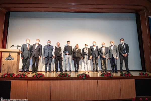 Törende Başkan Soyer, logo tasarım yarışmasını kazanan Mahir Akkoyun’a bir plaket takdim etti.