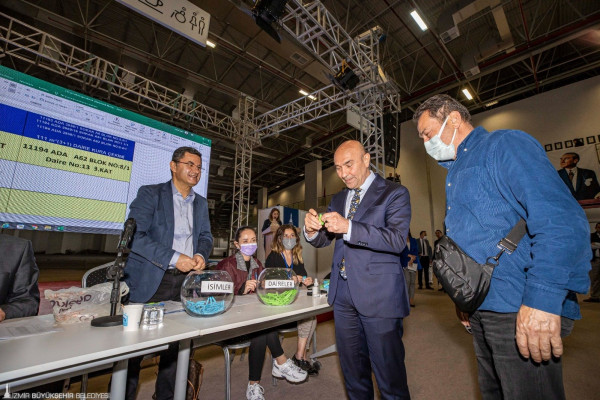 Başkan Soyer konuşmasının ardından hak sahiplerinden Abidin Nişancı, Karabağlar Belediye Başkanı Muhittin Selvitopu ise Mehmet Ali Öleki için kura çekti.