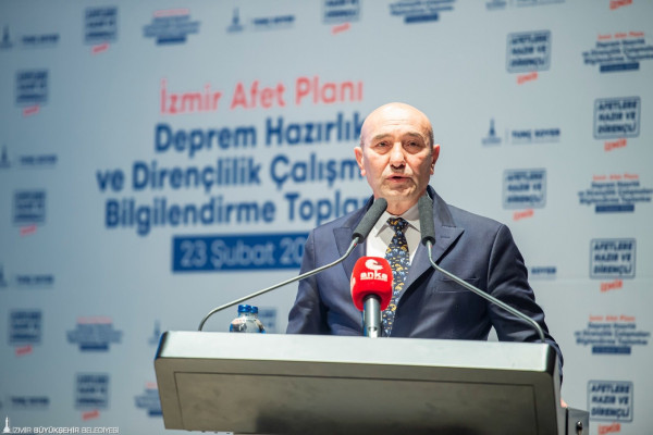 İzmir’de 30 Ekim 2020’de meydana gelen depremin ardından Türkiye’nin en kapsamlı deprem araştırmaları ve risk azaltma projelerini başlatan İzmir Büyükşehir Belediye Başkanı Tunç Soyer’in ev sahipliğinde “İzmir Afet Planı-Deprem Hazırlık ve Dirençlilik Çalışmaları” toplantısı başladı. Ahmed Adnan Saygun Sanat Merkezi’nde İzmir’de üç yıldır sürdürülen çalışmaların anlatılacağı toplantının açılışında konuşan Başkan Tunç Soyer, “Üzerinde yaşadığımız fayları değiştiremeyeceğimize göre, bu faylarla barışık bir hayatı nasıl mümkün kılarız, bunun için birlikte düşüneceğiz” dedi.