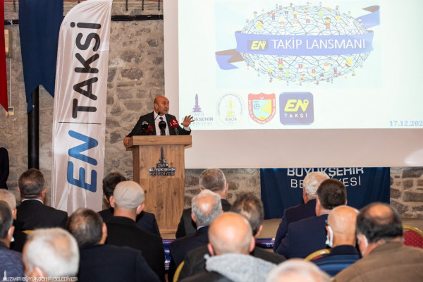İzmir’de 3 bin 579 taksinin tek ekrandan kontrol edilmesini sağlayacak “En Takip Sistemi” başladı. Kentteki taksi hareketliliğinin ölçümü, vatandaş şikayetlerinin incelenmesi, trafik akışının düzenlenmesi gibi pek çok verinin elde edilmesinde fayda sağlayacak uygulamanın tanıtımı Tarihi Havagazı Fabrikası’nda yapıldı. Tanıtım törenine İzmir Büyükşehir Belediye Başkanı Tunç Soyer, İzmir Esnaf ve Sanatkarlar Odaları Birliği Başkanı Zekeriya Mutlu, İzmir Şoförler ve Otomobilciler Esnaf Odası Başkanı Celil Anık, Mobilbil firmasının CEO’su Ahmet Dönmezoğlu, Uluslararası Toplu Taşımacılar Birliği (UITP) Üyelik, Pazarlama ve Hizmetler Kıdemli Direktörü Kaan Yıldızgöz, İzmir Büyükşehir Belediyesi Başkan Vekili Mustafa Özuslu, İzmir Büyükşehir Belediyesi Genel Sekreteri Dr. Buğra Gökçe, İzmir Büyükşehir Belediyesi Genel Sekreter Yardımcıları Eser Atak, Yıldız Devran, Barış Karcı, ESHOT Genel Müdürü Erhan Bey, taksi sahipleri, meclis üyeleri ve bürokratlar katıldı.