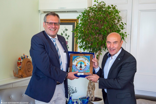 İzmir Büyükşehir Belediye Başkanı Tunç Soyer, Dünya Kardeş Şehirler Turizm Birliği Başkanı (TCWTA) ve Almanya’nın Bingen am Rhein Belediye Başkanı Thomas Feeser’i makamında ağırladı. Ziyarete TCWTA Başkan Yardımcısı Jürgen Port, TCWTA Genel Sekreteri Hüseyin Baraner yer aldı. 2-11 Eylül tarihlerinde 91. İEF kapsamında düzenlenecek uluslararası gastronomi fuarının heyecanı içerisinde olduğunu ifade eden Başkan Tunç Soyer, “Bu fuarı düzenlememizin bir temel nedeni var. Her vatandaşımızın yeterince ve sağlıklı gıdaya erişimini güvence altına almak. Gastronomi sadece lezzet değil. Sağlık, tarih, turizm, enerji her şey iç içe. Biz, yerelden ama tüm dünyaya ilham olabilecek güçte bir tarım politikası inşa etmek zorundayız” dedi.