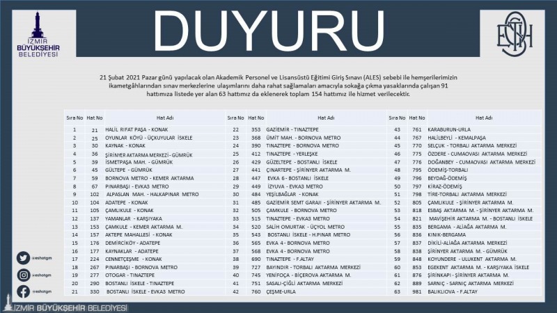 İzmir Büyükşehir Belediyesi ESHOT Genel Müdürlüğü, 21 Şubat Pazar günü yapılacak ALES’e özel sefer programı oluşturdu. Sokağa çıkma kısıtlılığı nedeniyle 91 hatta hizmet veren kurum, sınava girecek vatandaşlar için ek 63 hatta daha sefer yapacak.