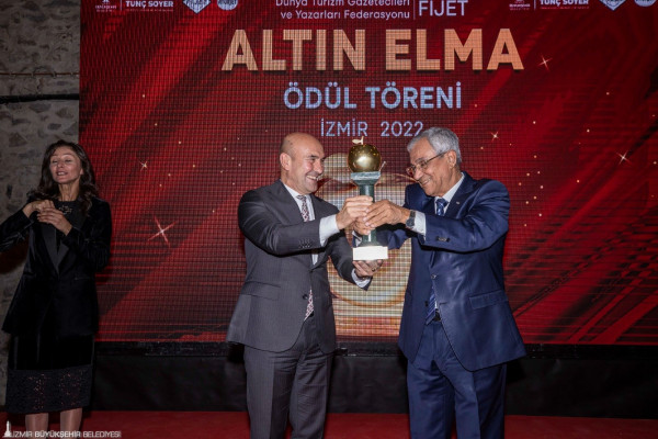 Uluslararası Turizm Gazetecileri ve Yazarları Federasyonu (FİJET), “Dünya Turizm Oscar”ı olarak anılan “Altın Elma Ödülü”nü bu yıl kentin tarihi ve kültürel değerlerini koruyarak turizm faaliyetlerini destekleyen İzmir Büyükşehir Belediyesi’ne verdi. İzmir Büyükşehir Belediye Başkanı Tunç Soyer, ödülü Dünya Turizm Gazetecileri ve Yazarları Federasyonu Başkanı Tijani Haddad’ın elinden aldı.