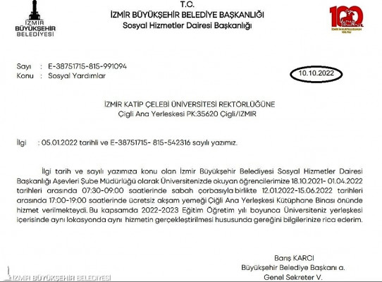 İzmir Büyükşehir Belediyesi gençlerimizin bu zorlu ekonomik koşullarda ücretsiz sıcak yemek hizmetinden mahrum kalmaması için dağıtım araçlarını kampüs alanı dışında konuşlandırarak faaliyetlerini sürdürmektedir. Katip Çelebi Üniversitesi yönetiminin izin talebimizi işleme alarak gerekli kolaylığı sağlaması halinde, öğrencilerimiz geçen yıl olduğu gibi yemek dağıtımlarından daha sağlıklı koşullarda faydalanabilecektir.