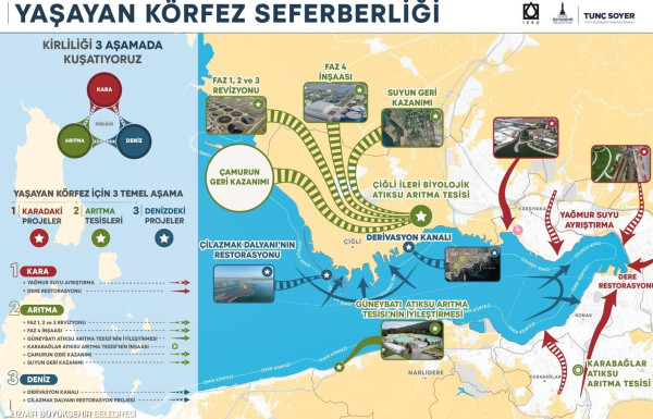 -Çiğli Atıksu Arıtma Tesisi’nden çıkarak iç körfeze dökülen arıtılmış atık suların mevcut deşarj noktası değiştirilecek. 200 milyon lira maliyetle açılacak derivasyon kanalı aracılığıyla, arıtılmış tatlı sular eski Gediz yatağına ve buradan da orta Körfez’e taşınacak. Projenin yapımı Çevre Şehircilik Bakanlığı’nın iznini takiben başlayacak ve kısa sürede tamamlanacak.