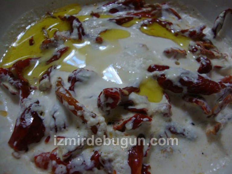 5- Kırmızıbiberler başka bir kaba aktarılıp yoğurtla karıştırılır.