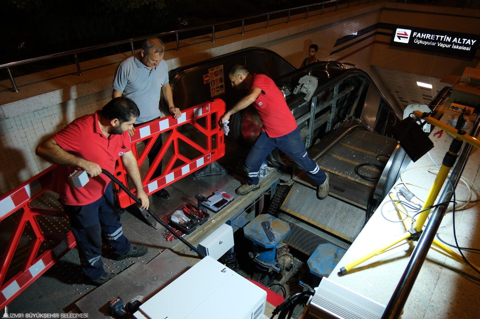 İzmir Büyükşehir Belediye Başkanı Dr. Cemil Tugay’ın talimatıyla başlatılan yürüyen merdiven ve asansör bakım çalışmaları, gece gündüz demeden hızla sürdürülüyor. Yürüyen merdiven ve asansör kazalarının bir daha yaşanmaması için daha önce yapılmamış ölçüde, detaylı bakım ve onarım çalışması başlatan İzmir Büyükşehir Belediyesi, İzmir Metro AŞ bünyesinde yer alan istasyonlarda riskli gördüğü yürüyen merdiven ve asansörleri kullanıma kapatmıştı. Gerekli tespitlerin ardından yedek parça temin sürecini başlatan İzmir Büyükşehir Belediyesi, parça montajı yapılarak kontrolleri tamamlanan merdivenleri yeniden kullanıma açmaya başladı.